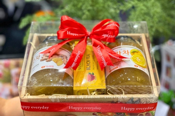 Gợi ý: Hãy tặng kèm trong giỏ quà những hũ thức uống làm sẵn tiện lợi như chanh ngâm mật ong hoặc gừng mật ong.